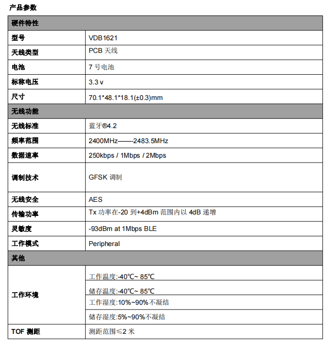 VDB1621 基于 Nordic BLE 4.2 芯片。其內(nèi)部由 2 節(jié) 7 號(hào)電池供電,電池續(xù)航時(shí)間與 VDB1621 的廣播參數(shù)有關(guān),外部鏡片用作測(cè)距透光,帶防拆按鍵。